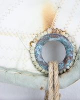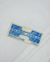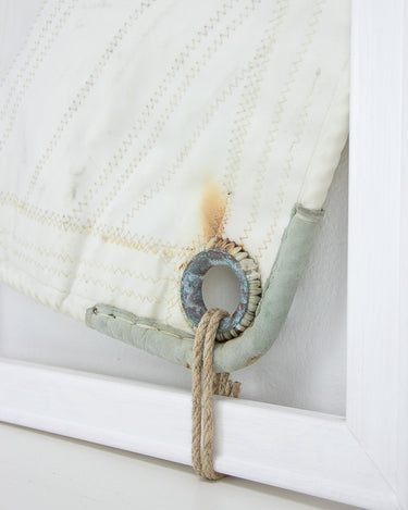 "Monfalcone" è un tributo alla tradizione nautica italiana: una porzione di vela randa in Dacron bianco, rinforzata a mano con pelle e cuciture robuste, segnata dalla salsedine, dal tempo, dal vento.