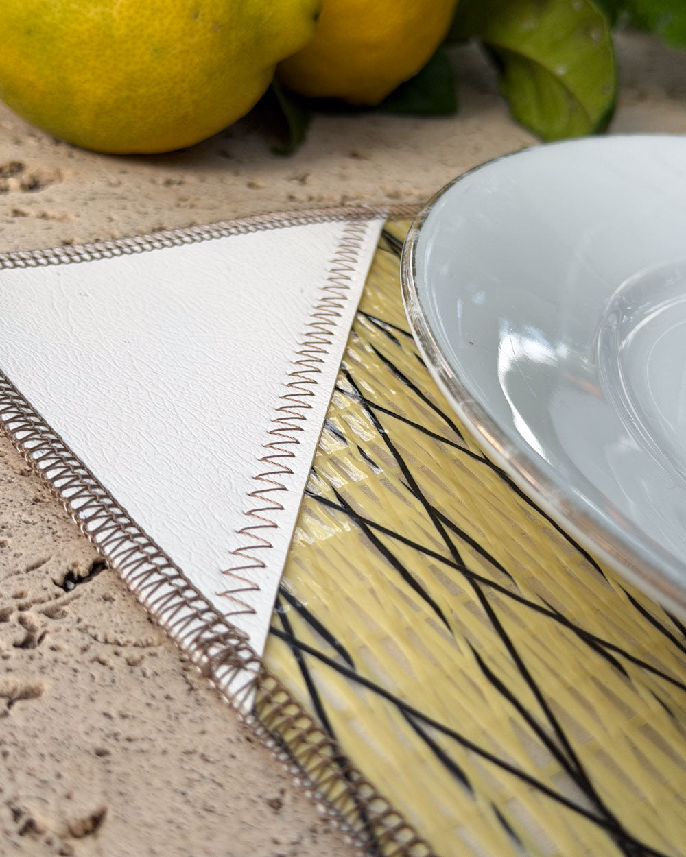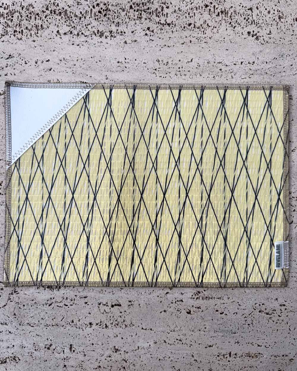 L'inserto e il retro della tovaglietta è rivestito con materiale antiscivolo bianco, la trama in Kevlar della vela ricorda il giallo del limone