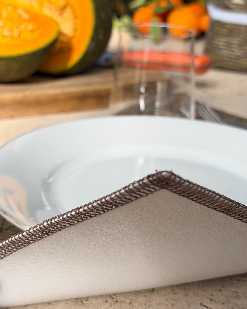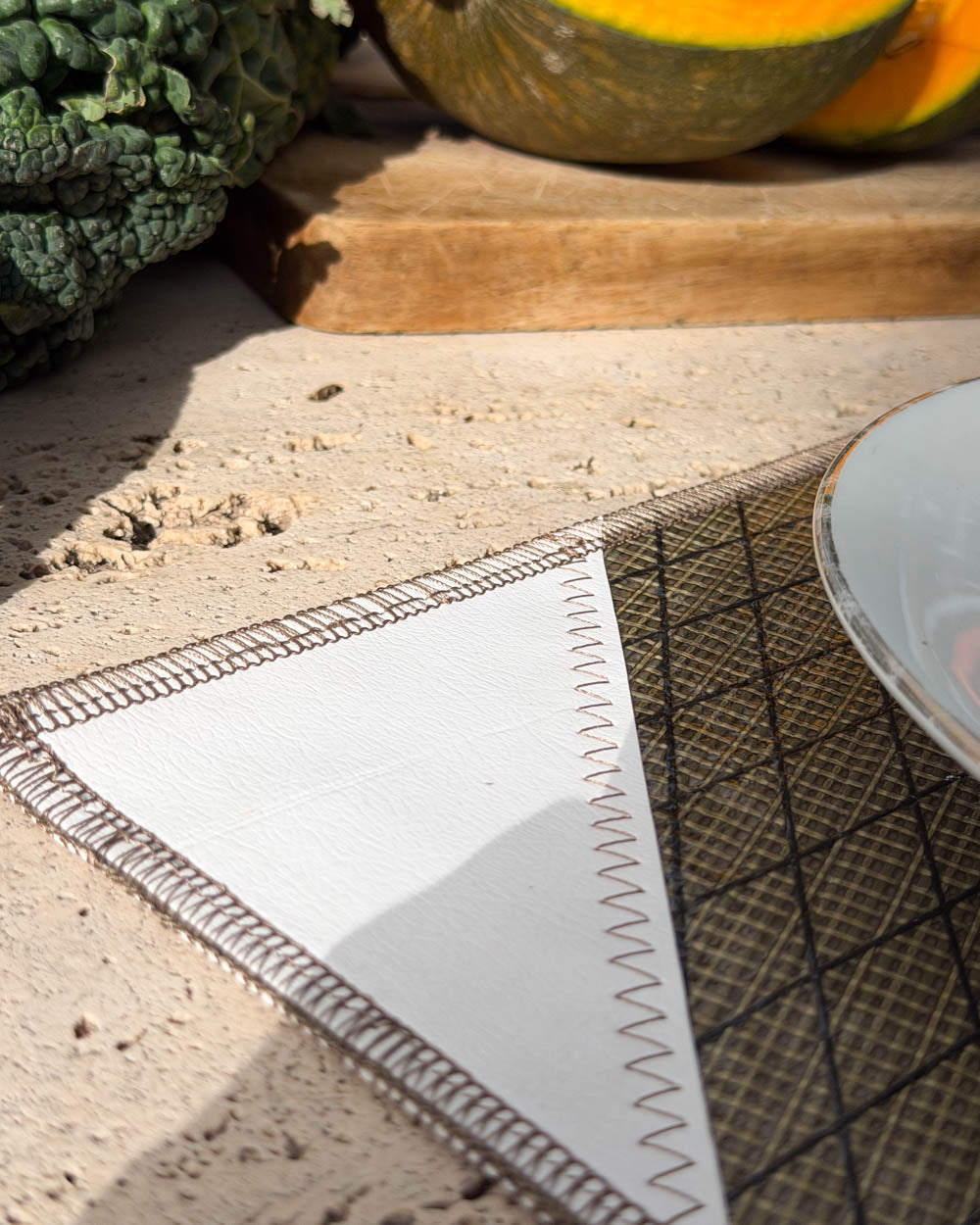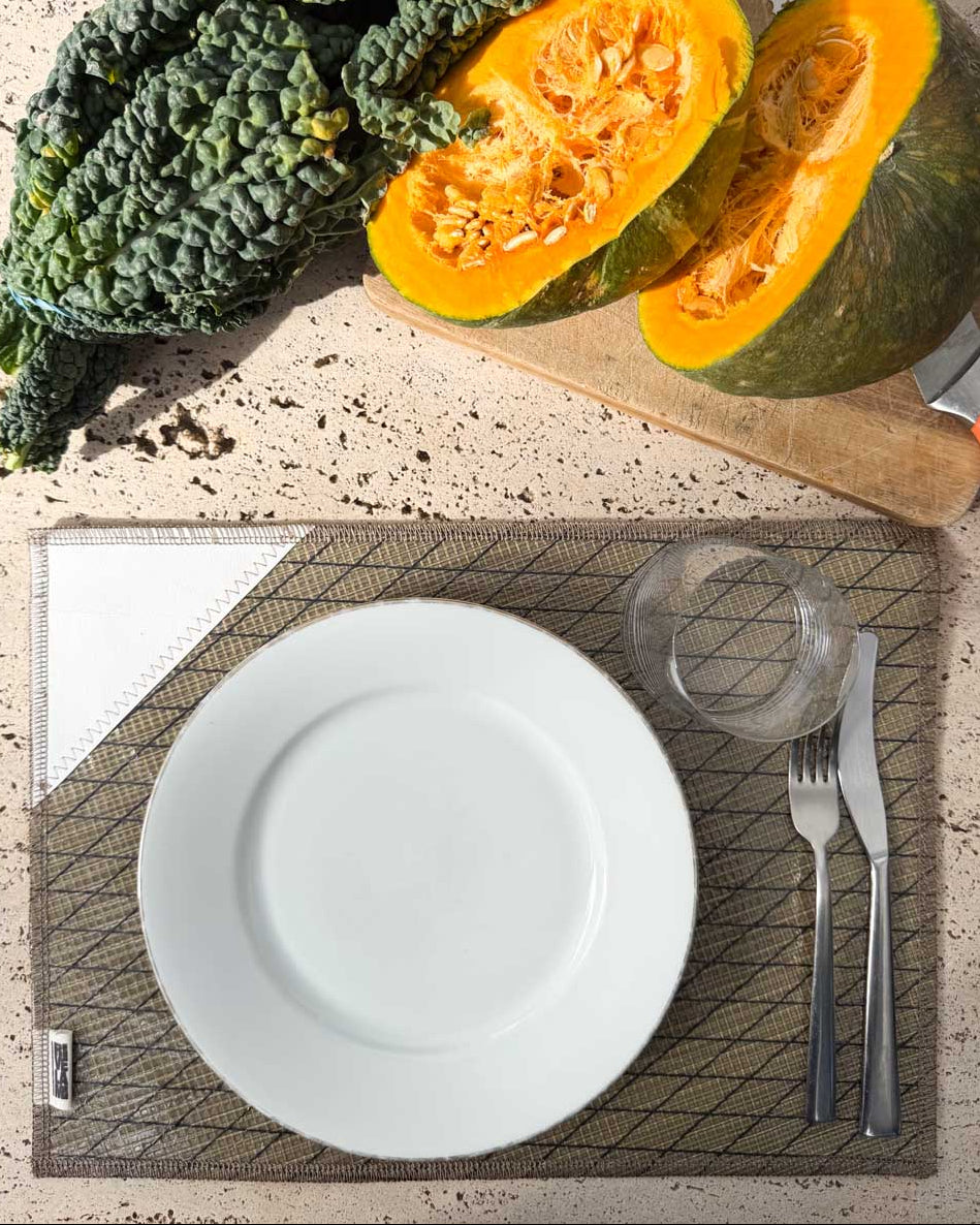L'inserto e il retro della tovaglietta è rivestito con materiale antiscivolo bianco, la superficie della vela ricorda il colore delle foglie d'ulivo e della buccia della zucca. Un verde-grigio particolare, elegante che renderà la tua tavola davvero unica