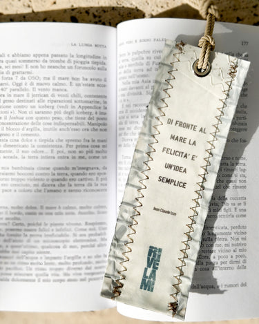 Bookmark made with recycled sails which contains the famous phrase by Wystan Hugh Auden: