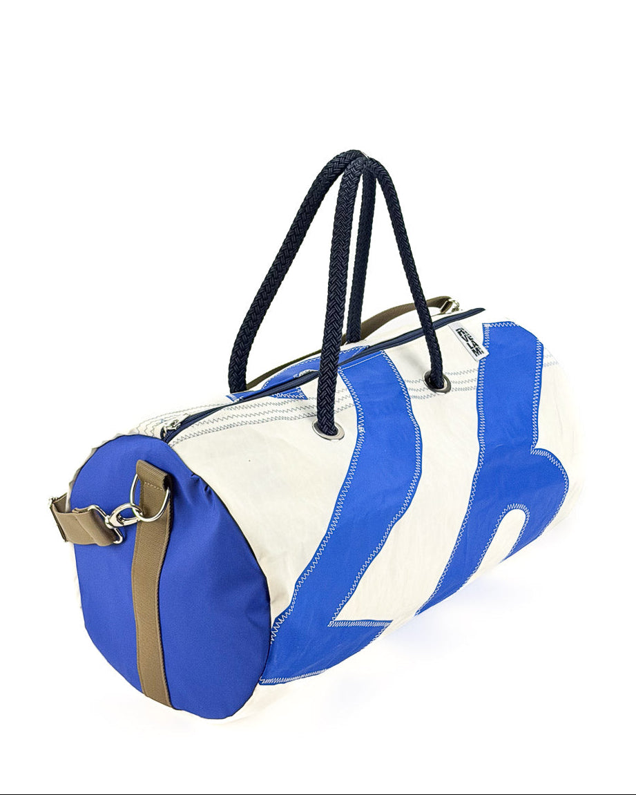 Il tessuto in vela nautica riciclata conserva la sua natura tecnica: resistente, leggero e flessibile. La struttura morbida consente di ripiegare il borsone, rendendolo pratico da riporre quando non viene utilizzato.