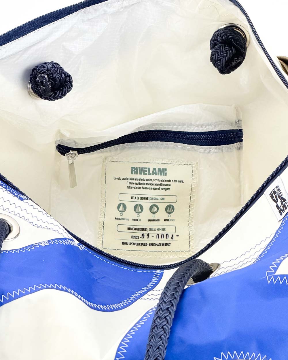 Dal 2026, ogni prodotto Rivelami è accompagnato da una Carta d’Imbarco con numero di serie univoco, riportato anche sull’etichetta interna. Un segno concreto di tracciabilità, che racconta la storia della vela e il valore del recupero consapevole.