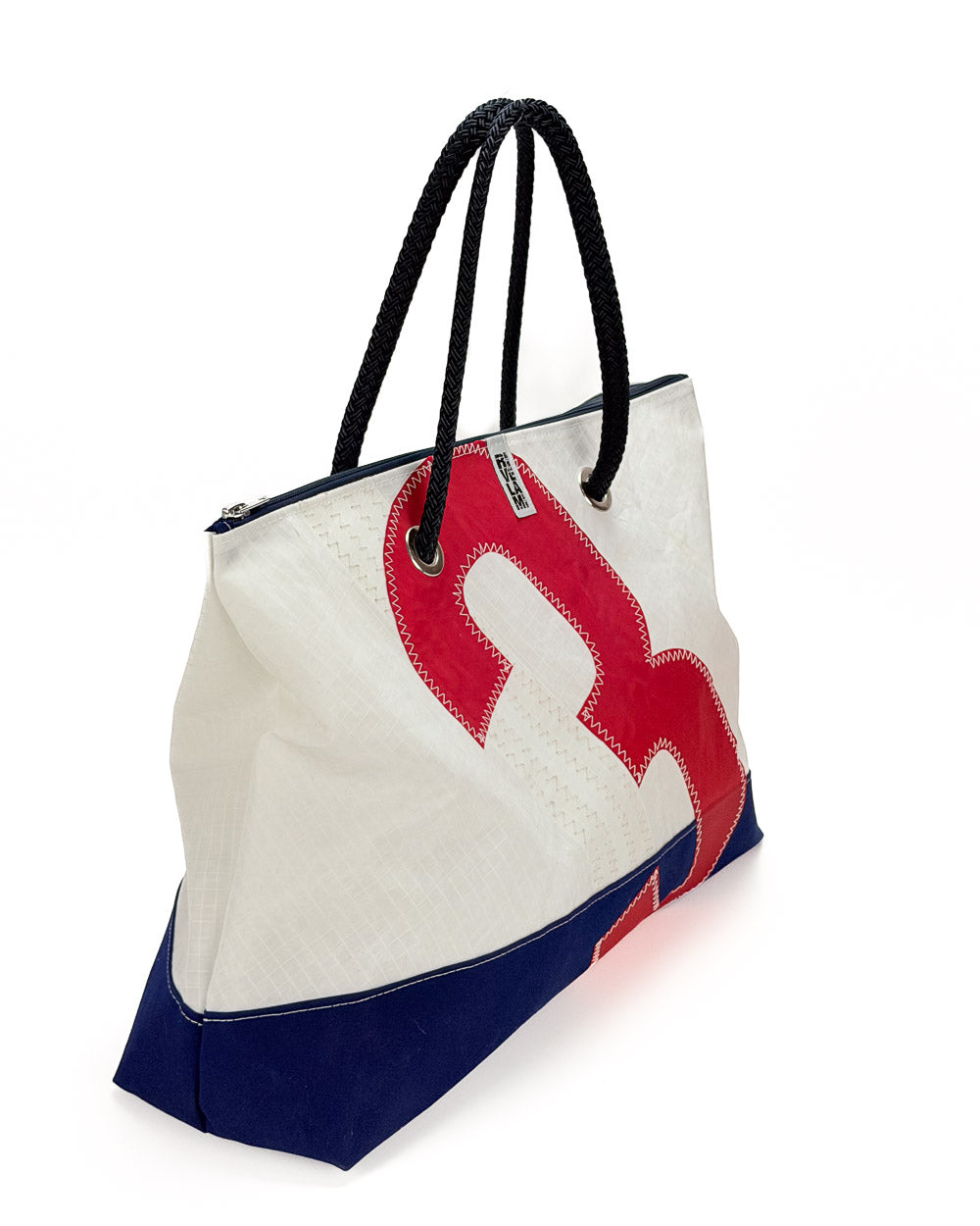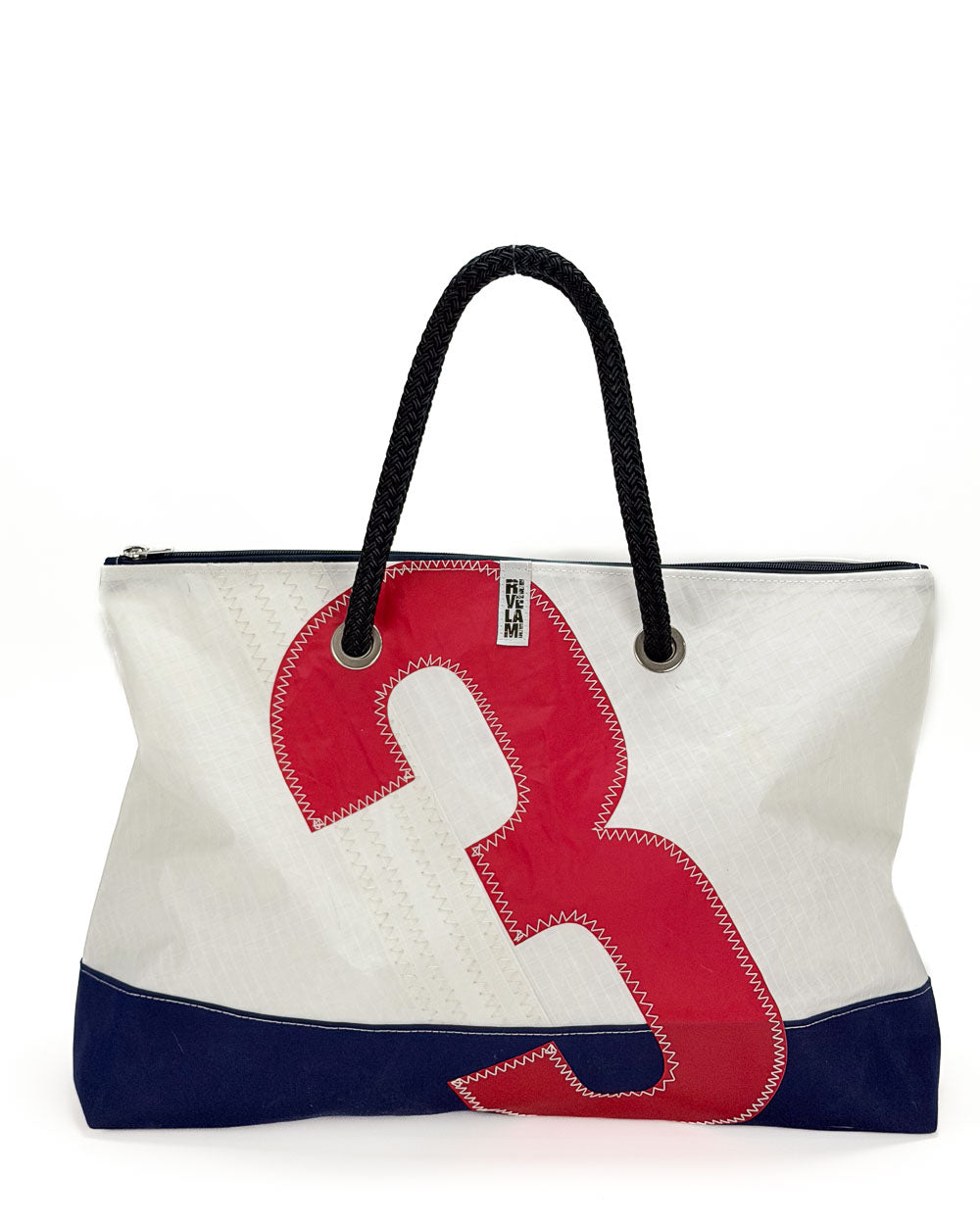 È realizzata interamente in vela riciclata, con un grande numero velico cucito a zig zag sul fronte: un segno grafico deciso, che racconta la vita precedente della vela e rende ogni borsa irripetibile. Il fondo rinforzato in tessuto tecnico garantisce struttura e resistenza anche a pieno carico, mentre la fodera interna in vela Spinnaker in nylon aggiunge leggerezza, colore e protezione.