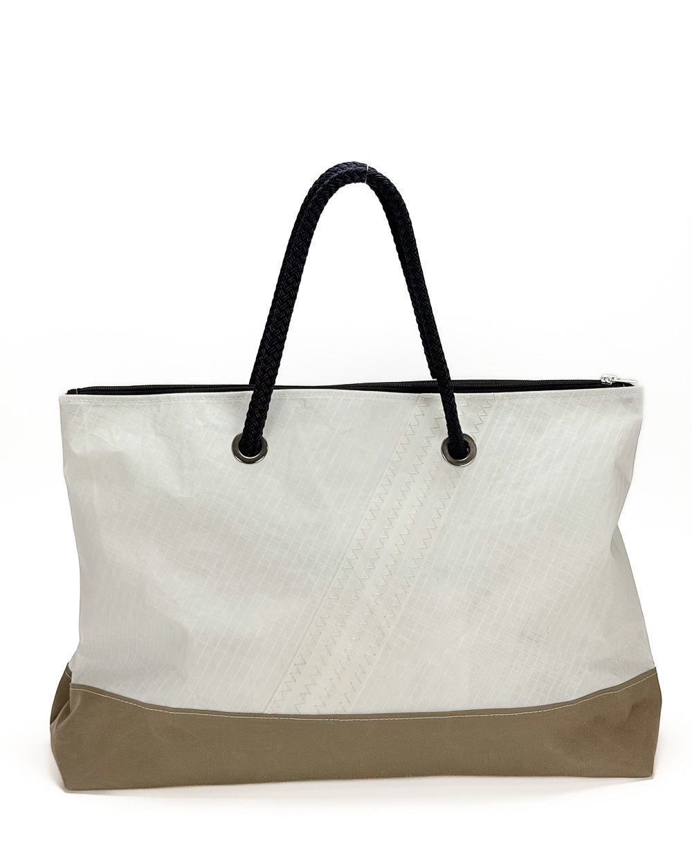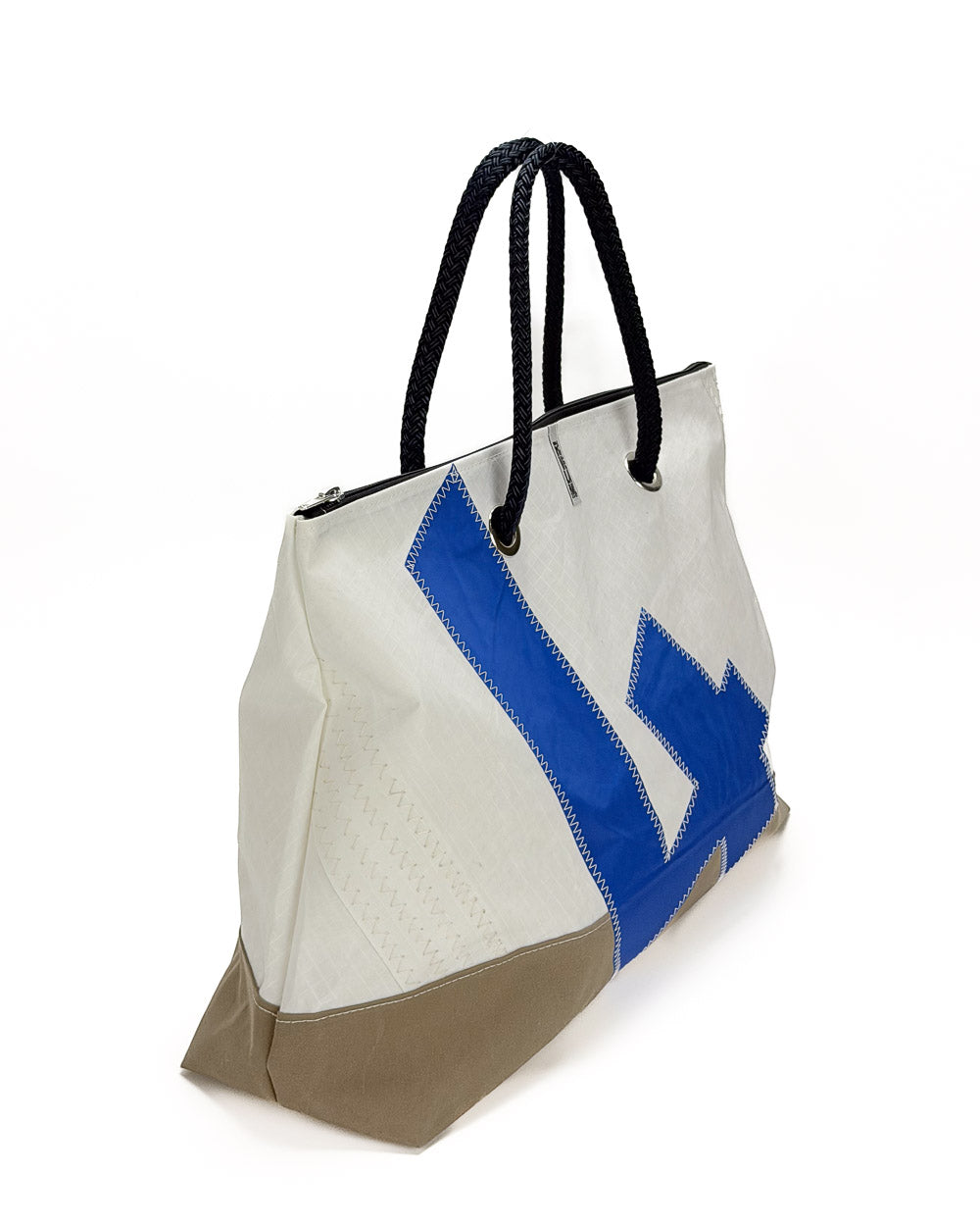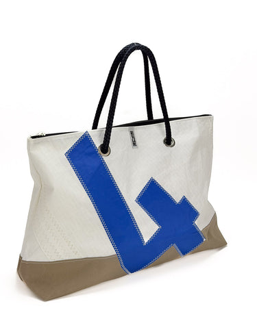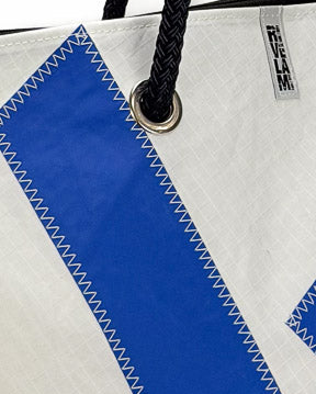 È realizzata interamente in vela riciclata, con un grande numero velico cucito a zig zag sul fronte: un segno grafico deciso, che racconta la vita precedente della vela e rende ogni borsa irripetibile. Il fondo rinforzato in tessuto tecnico garantisce struttura e resistenza anche a pieno carico, mentre la fodera interna in vela Spinnaker in nylon aggiunge leggerezza, colore e protezione.