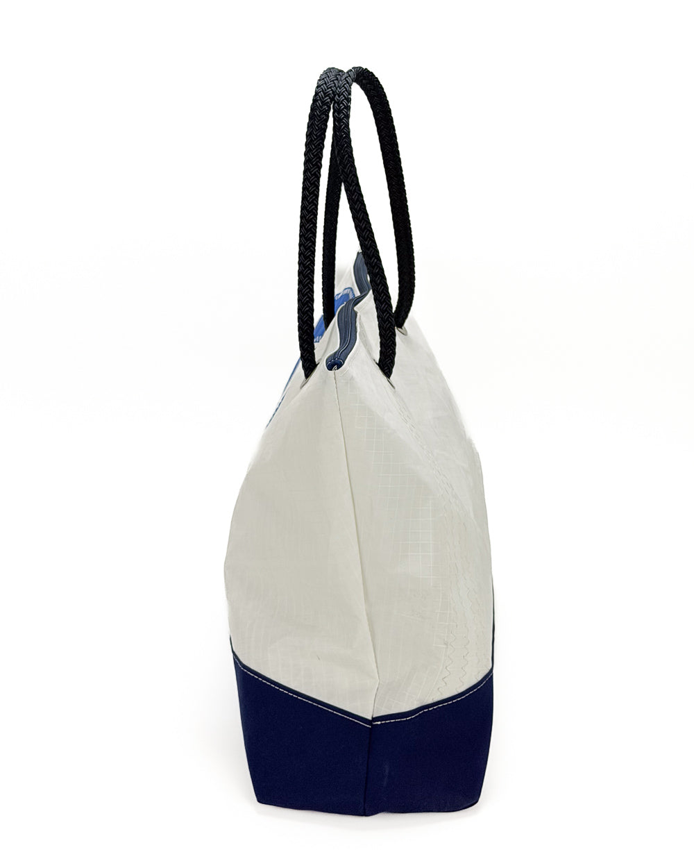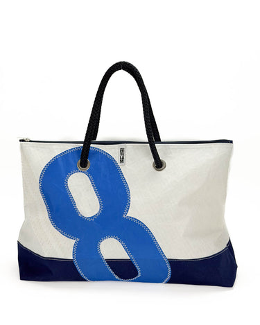 È realizzata interamente in vela riciclata, con un grande numero velico cucito a zig zag sul fronte: un segno grafico deciso, che racconta la vita precedente della vela e rende ogni borsa irripetibile. Il fondo rinforzato in tessuto tecnico garantisce struttura e resistenza anche a pieno carico, mentre la fodera interna in vela Spinnaker in nylon aggiunge leggerezza, colore e protezione.