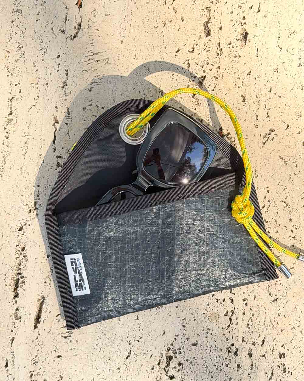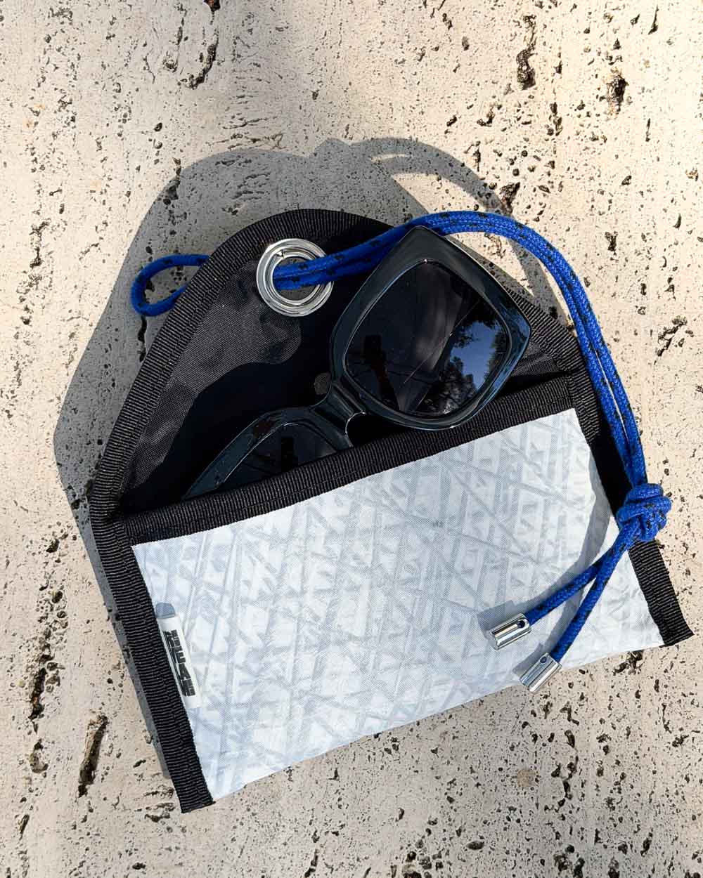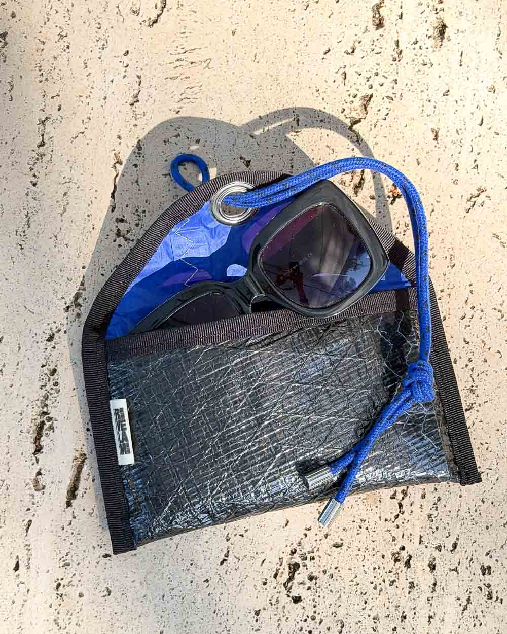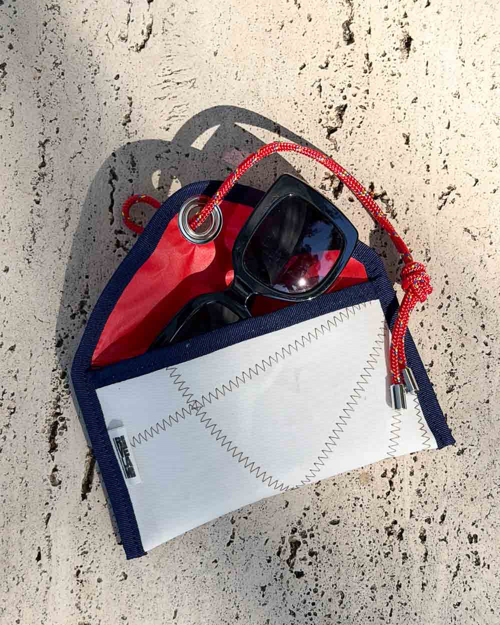 Custodia realizzata con vele recuperate, imbottita per proteggere al meglio i tuoi occhiali o il tuo smartphone. Il tipo di vela rende la custodia robusta e protegge dagli schizzi d'acqua quello che vorrai tenere al sicuro.