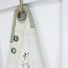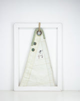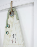 "Penna '77" è una porzione rara di vela Fiocco in Dacron, risalente al 1977, con rinforzi in pelle cuciti a mano, occhielli ossidati dalla salsedine e – soprattutto – la firma originale dello stazzatore, a testimonianza di una vita in mare iniziata quasi mezzo secolo fa.