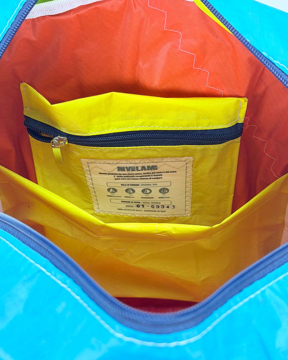 Per la produzione dei nostri articoli, utilizziamo esclusivamente il tessuto recuperato da vele usate. Gli inserti in tessuto tecnico derivano da surplus di produzioni. La minuteria, le zip, i nastri e gli accessori vengono fornite da aziende italiane.