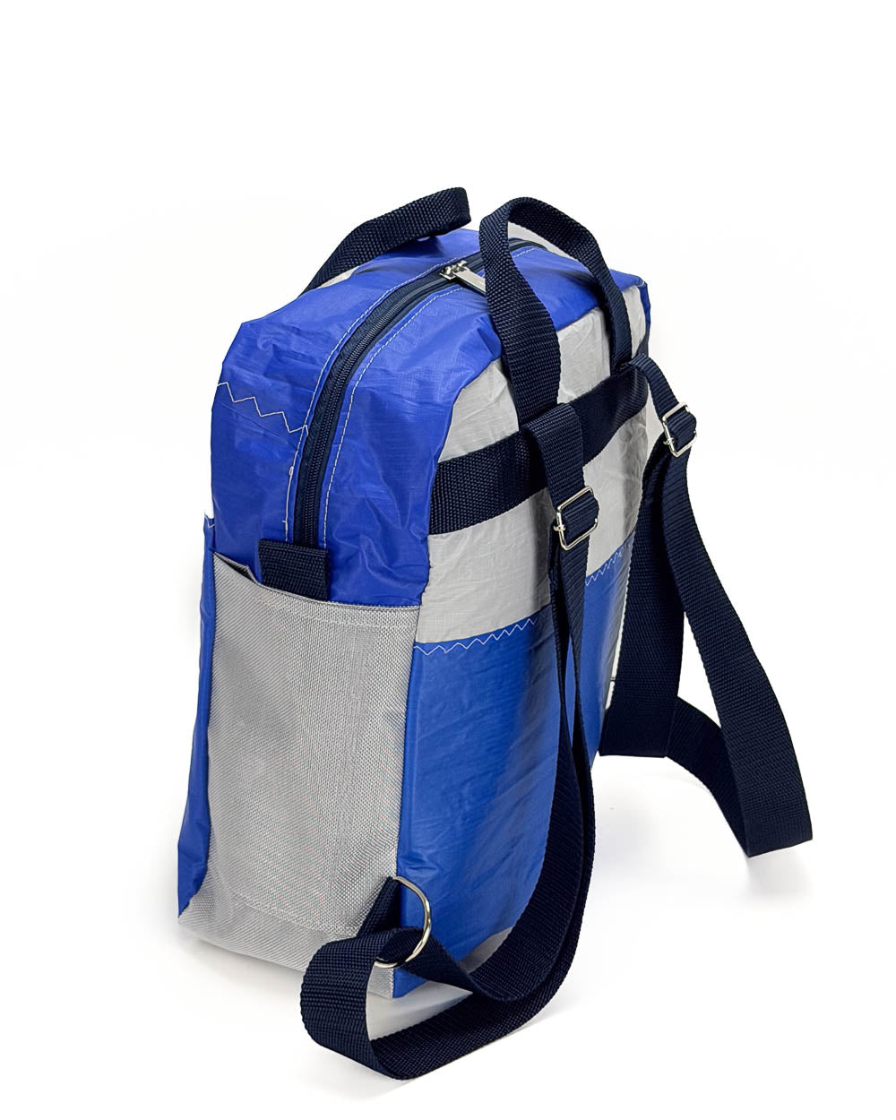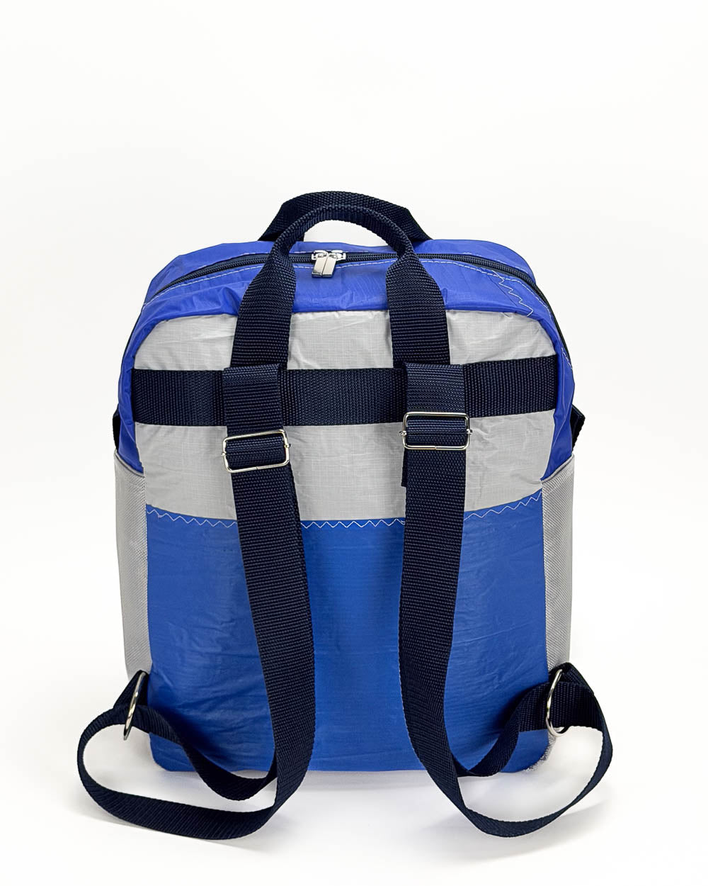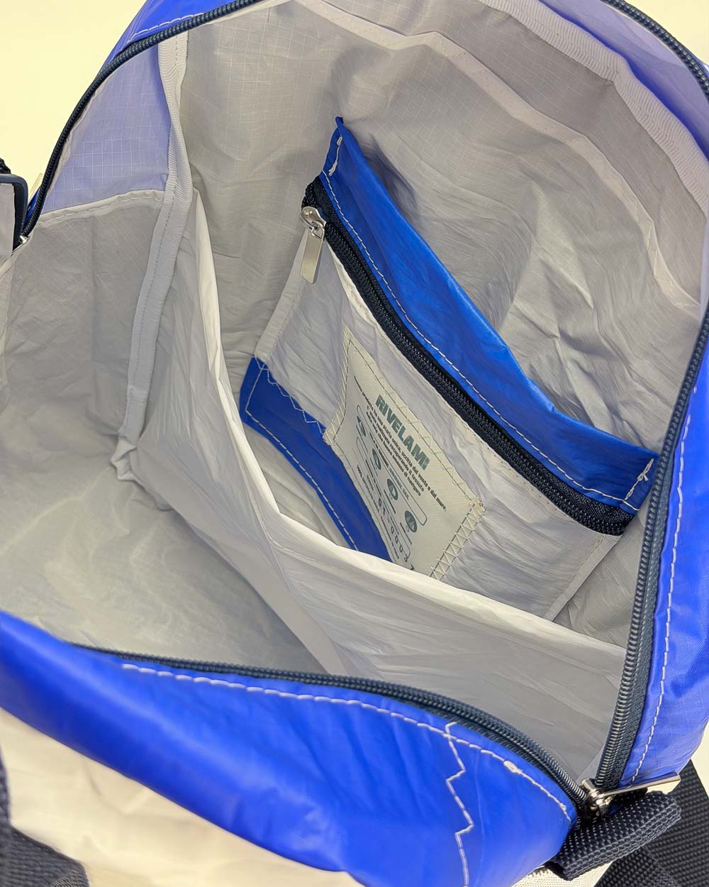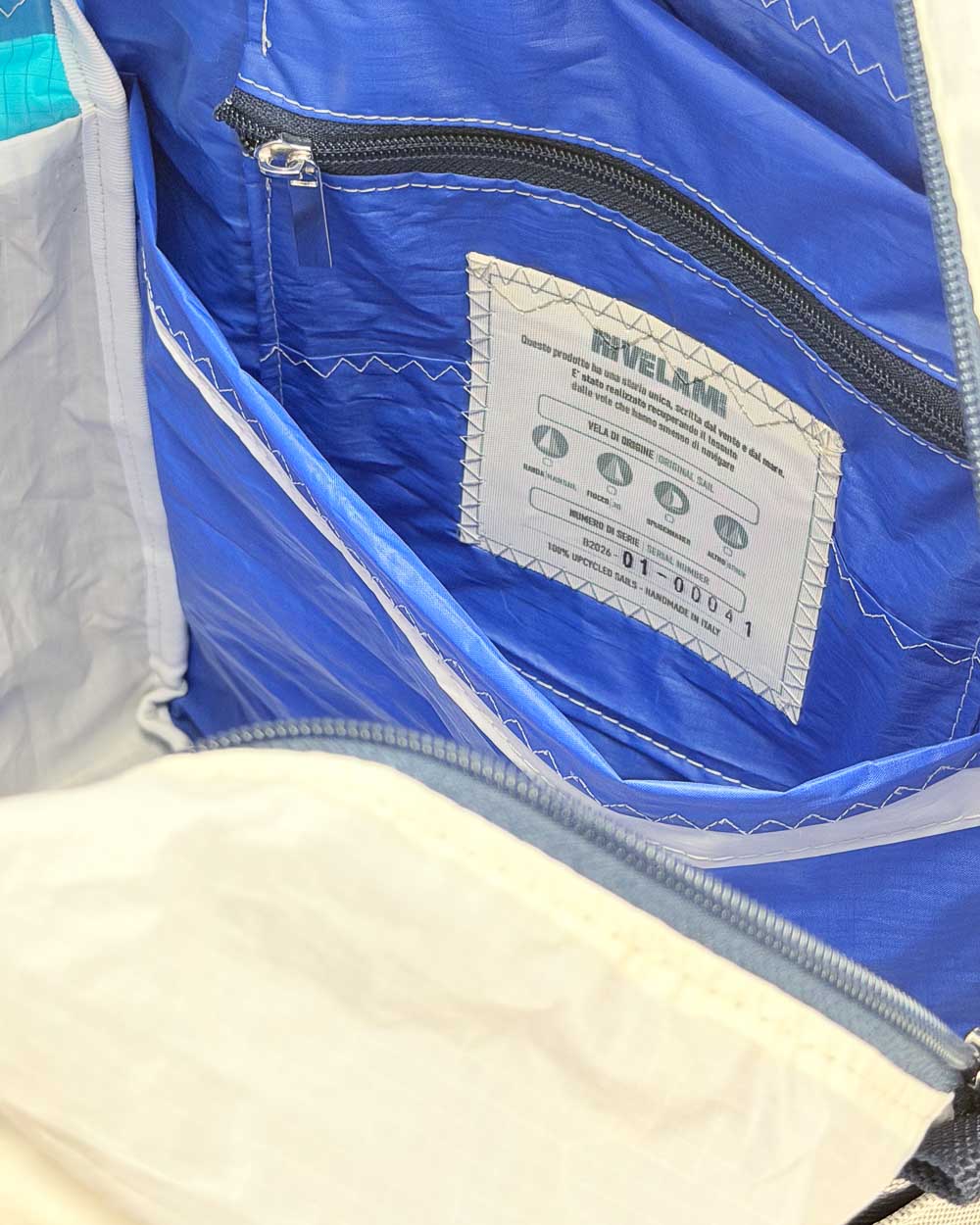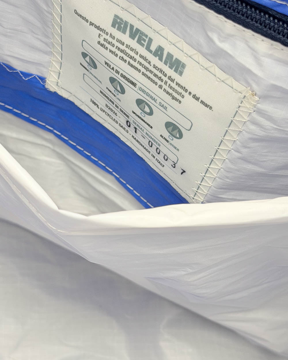 Per la produzione dei nostri articoli, utilizziamo esclusivamente il tessuto recuperato da vele usate. Gli inserti in tessuto tecnico derivano da surplus di produzioni. La minuteria, le zip, i nastri e gli accessori vengono fornite da aziende italiane.