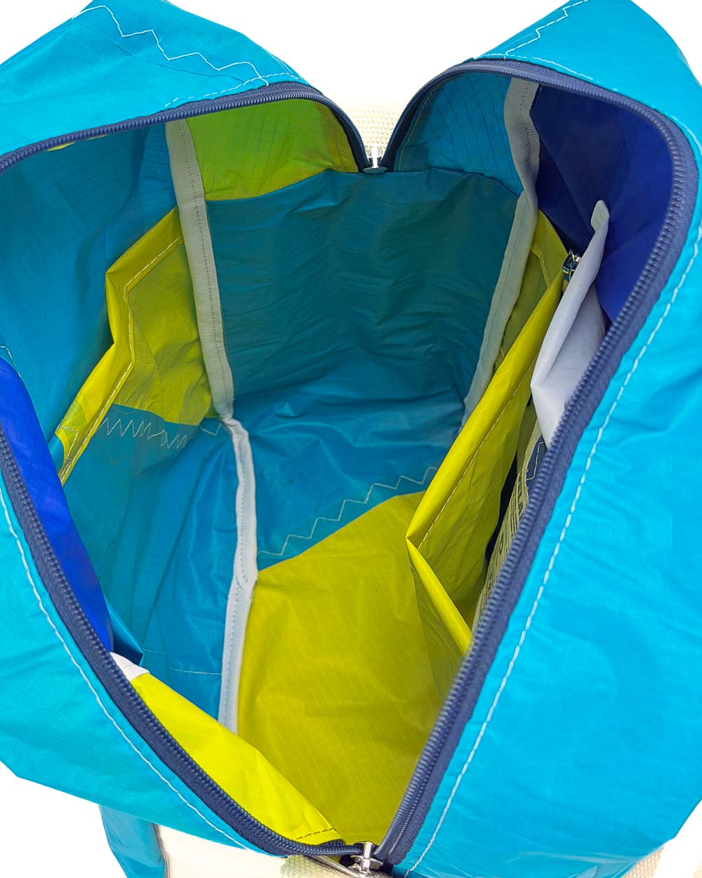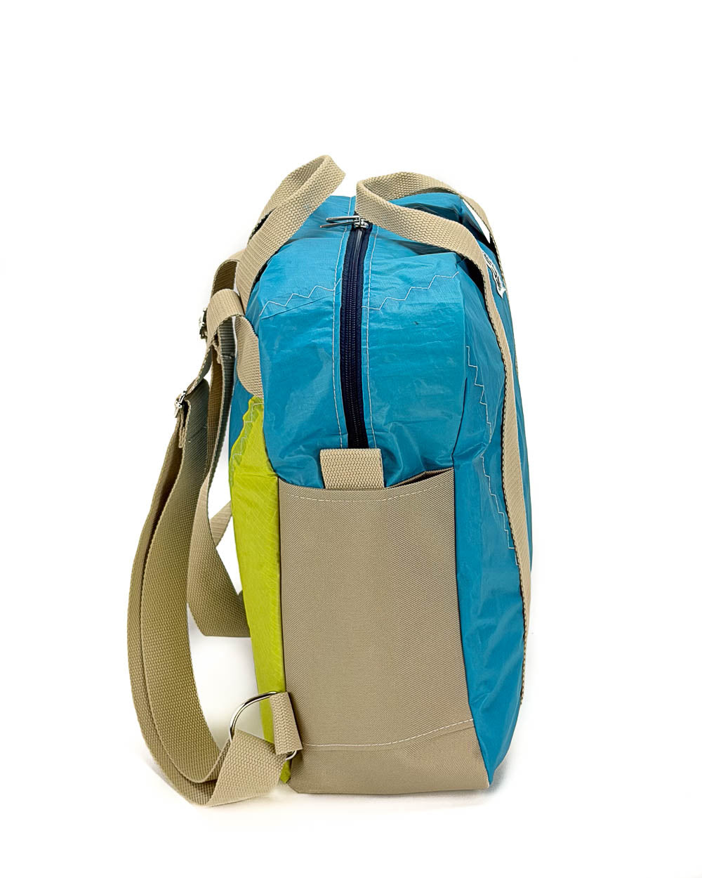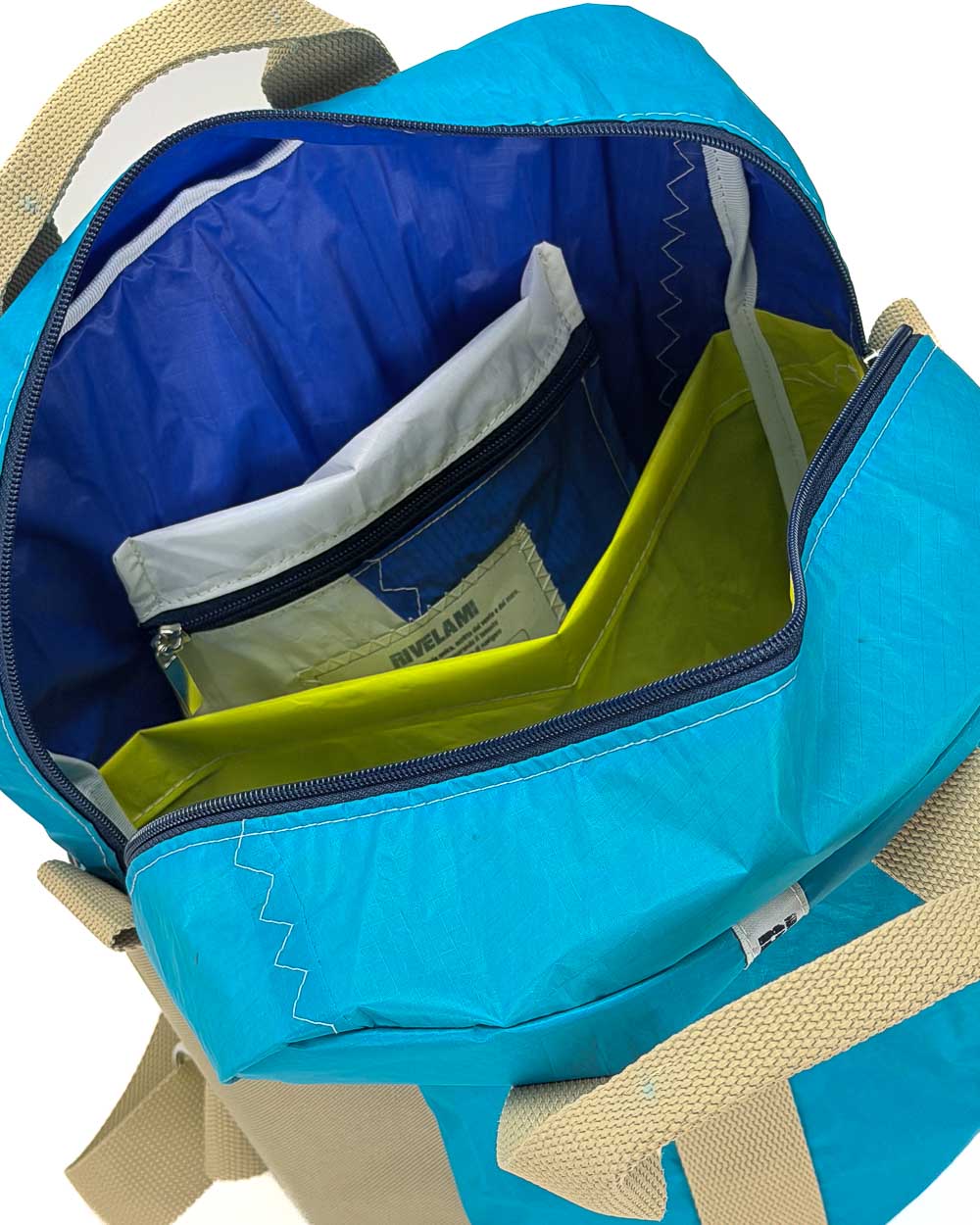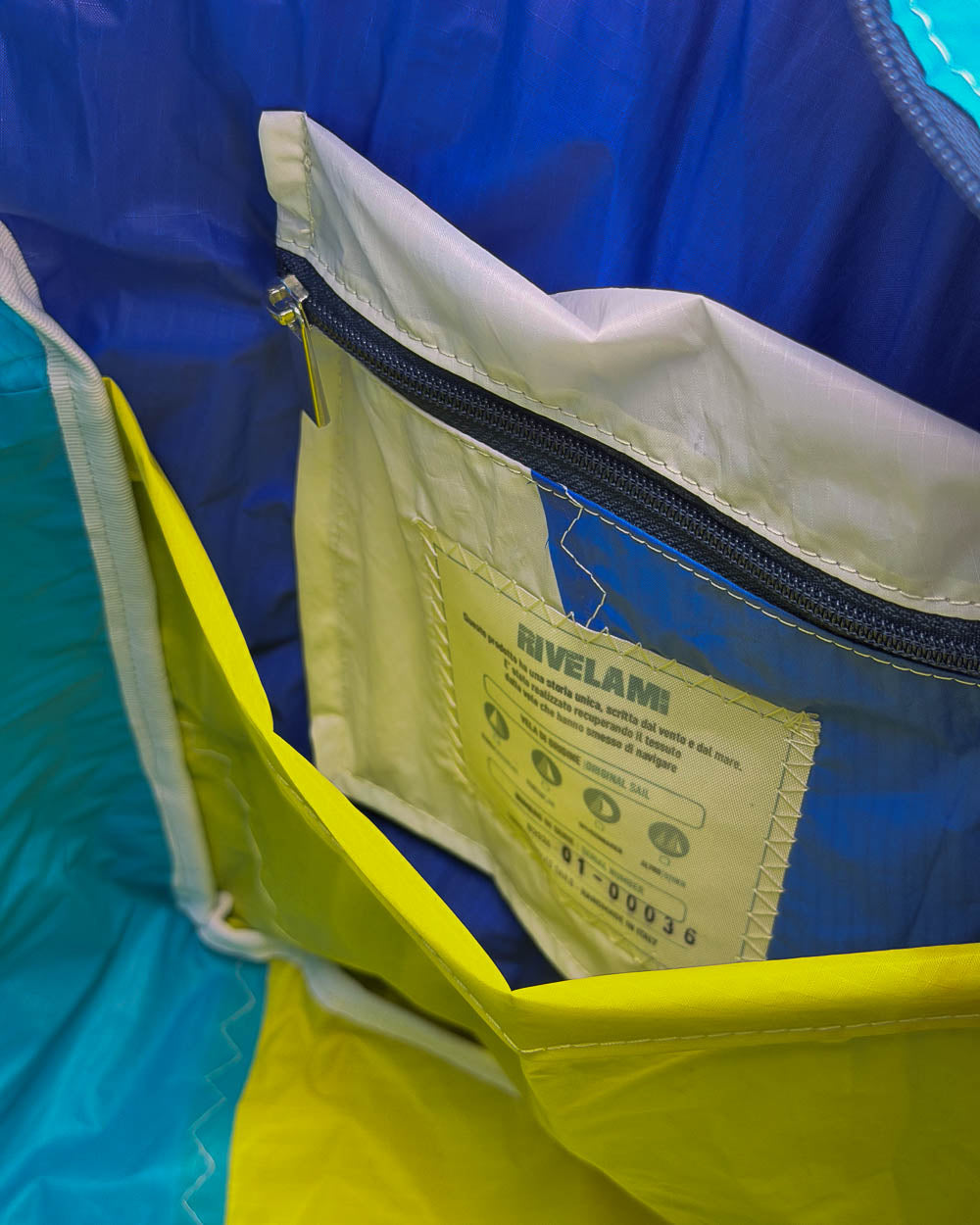 Per la produzione dei nostri articoli, utilizziamo esclusivamente il tessuto recuperato da vele usate. Gli inserti in tessuto tecnico derivano da surplus di produzioni. La minuteria, le zip, i nastri e gli accessori vengono fornite da aziende italiane.
